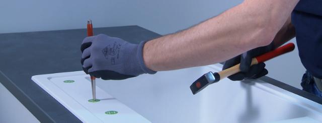 Monter køkkenvasken som monteringsvejledningen foreskriver og placer herefter en dorn på markeringen på vaskens overside. Slå med et hårdt slag på dornen for at slå hul i vasken.