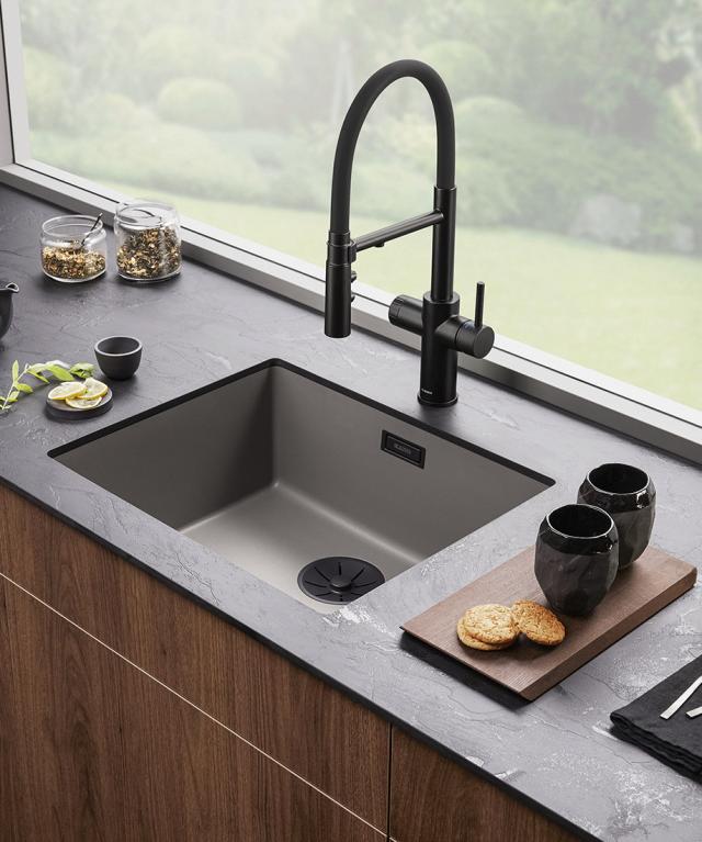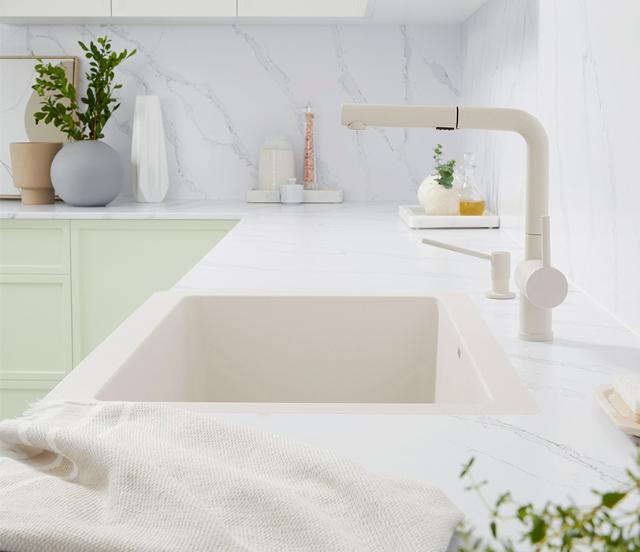 Du kan få et perfekt farvematch til din køkkenvask med et armatur i porcelæns- eller Silgranit-look.