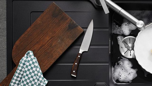 Du kan derfor sikkert lægge fødevarer fra dig direkte på vasken. Materialet kan hverken optage eller afgive lugt eller farve.