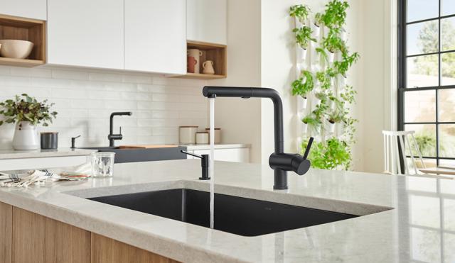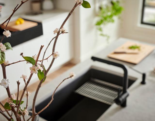 Ved at kombinere din Silgranit-vask med et køkkenarmatur i Silgranit-look kan du skabe et fuldendt og harmonisk udtryk – med et 100 % farvematch, der binder køkkenets design elegant sammen