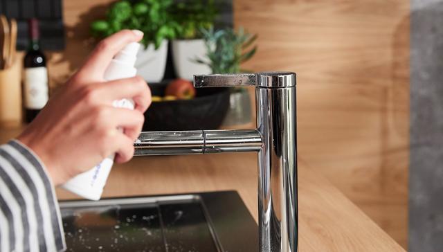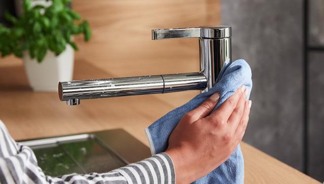 Tør armaturet af med en blød klud, skyl efter med rent vand, og tør det derefter med en tør mikrofiberklud for at forhindre kalkpletter. Hvis du vil undgå, at perlatoren (den lille si i tuden) kalker til, kan du tørre den af med en mikrofiberklud efter brug.