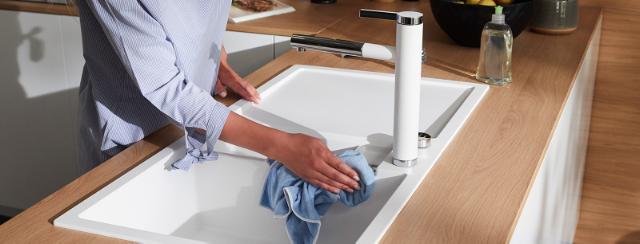 Brug BLANCO DailyClean+ eller almindeligt husholdningseddike til at opløse kalkaflejringer. Rengør med den bløde side af en opvaskesvamp, skyl med vand og tør efter med en mikrofiberklud. Undgå aggressive rengøringsmidler, da de kan beskadige overfladen og de indre dele.