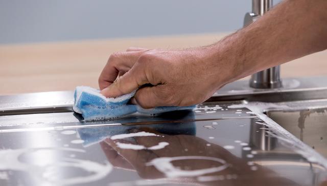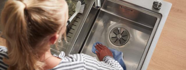- Trin 1: Rengør vasken - til daglig rengøring anbefales en blød svamp/mikrofiberklud med sulfo og BLANCO DailyClean+ til regelmæssig afkalkning af vasken.