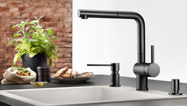 BLANCOs matsorte COMFORT løft-op afløbsbetjening sidder på vasken og åbner og lukker for kurveventilen så du slipper for at skulle have hænderne ned i det beskidte opvaskevand. Har du brug for at have håndsæbe eller sulfo ved hånden, kan du også få LATO sæbedispenseren i sort mat overflade. Så slipper du også for at have sæbebeholdere stående og fylde på bordpladen.
