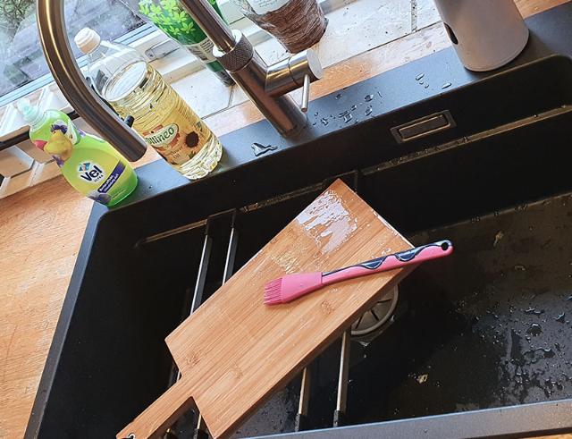 Sæt panden, gryden eller bradepanden fra dig. Super nemt, når bradepanden skal sættes i blød eller du bare har brug for at få de store ting væk fra bordet.