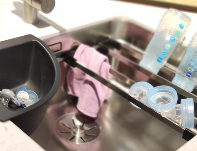 Folk bruger mange penge på ”flasketræer”, så sutteflaskerne kan tørre – her står de på skinnerne i vasken uden at fylde – uden at være i vejen.
