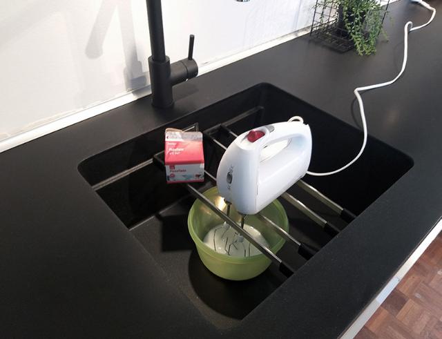 Skal du anrette et fad med forretter eller pynte de nybagte cupcakes, så er det super smart at stille fadet ned på ETAGON-skinnerne i vasken. Det giver en rigtig god arbejdshøjde!