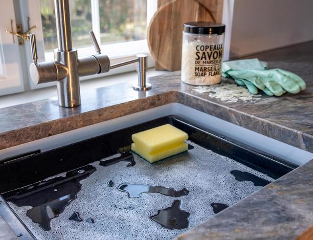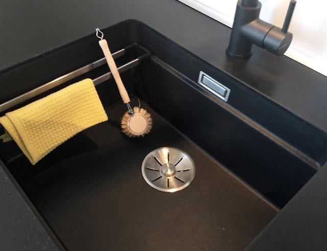 Stabl skinnerne i siden af køkkenvasken og opbevar karklud, opvaskebørste og opvaskesvamp.