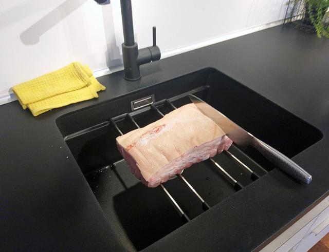 Rids og salt flæskesværen direkte på skinnerne. Det letter rengøring bagefter, hvor alt overskydende salt og væske ender i vasken i stedet for på køkkenbordet.