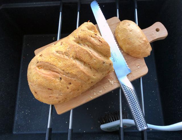 Placer et skærebræt på skinnerne, når brødet skal skæres. Så slipper du for at tørre krummer væk fra bordpladen bagefter.