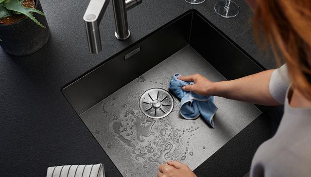 Skift afløbet til InFino-afløbet i mat sort og få en spændende effekt i den mørke stålvask.