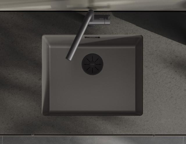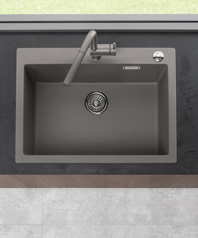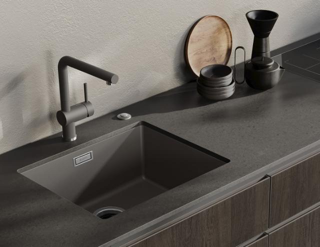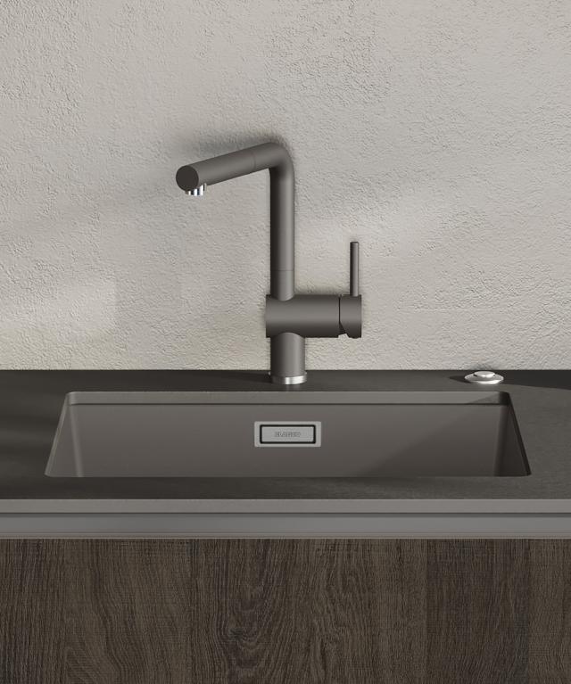 Du kan også bruge sorte detaljer med vulkangrå og lade elementerne omkring køkkenvasken få mere opmærksomhed. Kombiner din køkkenvask i vulkangrå med et armatur, afløbssæt eller andet tilbehør i sort mat, der skaber en elegant, mat kontrast til den varme, grå farve og giv køkkenindretningen ekstra power.
